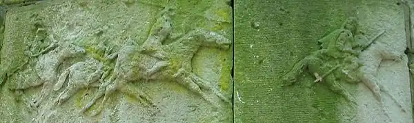 Ein zweites kleines Relief über der Tür des Turms zeigt einen Bären, der 2004 gerade noch wahrnehmbar war und sich laut Nehls in einem rechteckigen Wappen befindet. 1999 konnte Nehls noch eine bereits stark erodierte, aufrecht stehende zweite Figur erkennen, seiner Vermutung nach gleichfalls ein Bär.[45]