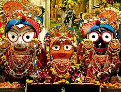 Im Tempel residieren als Trimurti (Dreiheit) Jagannath, sein „Bruder“ Balabhadra sowie seine „Schwester“ Subhadra,[1] alle drei bekleidet mit Seide und geschmückt mit goldenen Kostbarkeiten. Diese drei aus dem Holz des für Hindus heiligen Niembaumes geschnitzten Statuen stehen auf einem Podest aus Stein im nur Brahmanen zugänglichen Heiligtum.