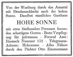 - ↑ N.N.: Baubeginn an der Hohen Sonne. In: Eisenacher Zeitung. Eisenach 11. November 1899.