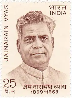 Jai Narayan Vyas, Sohn von Sewaramji Vyas, war nach der Unabhängigkeit Indiens vom Vereinigten Königreich am 15. August 1947 vom 3. März 1948 bis zu seinem Rücktritt am 7. April 1949 Premierminister von Jodhpur. Zugleich war er für den Indischen Nationalkongress (INC) erst Mitglied der Verfassunggebenden Versammlung (Constituent Assembly) beziehungsweise von 1950 bis April 1951 Mitglied des Provisorischen Parlaments (Provisional Parliament).