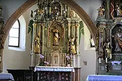 Die drei barockisierenden Altäre stammen aus der Mitte des 19. Jahrhunderts. An der Nordwand hängt ein Gemälde der Krönung Mariens von 1659.