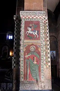 Die Kirche ist eine dreischiffige Basilika ohne Kuppel mit Satteldach, auf dem sich seitlich ein kleiner Glockenturm mit spitzer Haube befindet. Der durch Steinmetzarbeiten verzierte Haupteingang ist im mittleren der drei Bögen an der Westseite der Kirche, wo auch drei Chatschkare aus den Jahren 1504, 1571 und 1621 befestigt sind. Weitere Eingänge zur Kirche befinden sich an der südlichen und der nördlichen Wand. Im Inneren der Kirche sind an den Wänden und den in zwei Reihen stehenden Säulen mehrere Wandmalereien mit Heiligenbildern. Der Hauptaltar und die beiden Sakristeien stehen an der östlichen Innenwand.