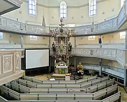 Chorraum und Kirchenschiff haben keine gemeinsame Achse, sondern bilden einen Winkel. 1935 wurden größere Umbaumaßnahmen unter dem Architekten German Bestelmeyer vorgenommen, die damals heftig in der örtlichen Presse diskutiert wurden.