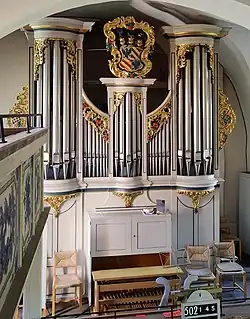 Friedrich Heidenreich baute 1769 eine Orgel mit 15 Registern auf einem Manual und Pedal, von der noch das Rokoko-Gehäuse erhalten ist. Das Innenwerk wurde 1895 durch die Firma Steinmeyer ersetzt, die eine zweimanualige Orgel mit derselben Registerzahl auf pneumatischen Kegelladen schuf. Das heutige Instrument stammt von dem Orgelbauer Ekkehard Simon, der 1978 im historischen Gehäuse ein Werk mit 25 Registern auf zwei Manualen und Pedal baute. Die Disposition lautet wie folgt:
