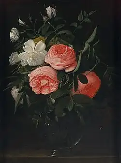 Er malte auch Blumenstillleben in Vasen, wie das Glas mit Rosen im Kunsthistorischen Museum. Er malte auch das Blumenstillleben in einer Steinnische (versteigert bei Hampel Fine Art Auctions am 5. Dezember 2008, Wien, Lot 263), das dem Vorbild des frühen 17. Jahrhunderts folgt, nämlich der Präsentation einer Blumenvase in einer Nische.[8]