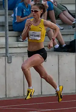 Die Mittelstreckenläuferin war 2007 Deutsche Hallenmeisterin über 800 Meter. Im selben Jahr nahm sie auch an den Halleneuropameisterschaften in Birmingham teil. 2008 wurde sie in Nürnberg über die 800 Meter Deutsche Meisterin. In diesem Rennen fiel die Zeitmessanlage aus und es war das erste Rennen bei Deutschen Meisterschaften ohne Siegerzeit. Bei der Team-Europameisterschaft 2009 im portugiesischen Leiria stellte Hartmann mit 2:00,71 min ihre persönliche Bestleistung auf und gewann mit der deutschen Mannschaft den Titel. Im selben Jahr nahm sie an den Weltmeisterschaften in Berlin teil. 2010 und 2011 wurde sie sowohl in der Halle als auch im Freien Deutsche Meisterin. Bei den Halleneuropameisterschaften 2011 in Paris schied sie im Halbfinale aus. In der Freiluftsaison erreichte sie bei der Team-Europameisterschaft in Stockholm mit der deutschen Mannschaft den zweiten Platz. 2013 beendete sie ihre Leistungssportkarriere bei den Deutschen Hallenmeisterschaften in ihrer Wahlheimat Dortmund.[1]