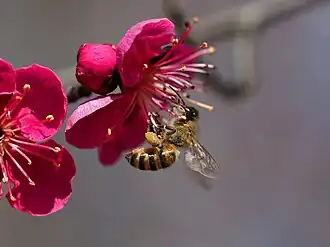 Japanische Honigbiene (Apis cerana japonica) auf einer Ume-Blüte | ||||||||||||
