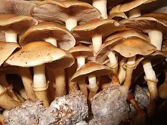 Japanische Stockschwämmchen in Kultur auf einem Pressspanblock | ||||||||||||