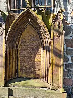 - Der Ortsfriedhof auf dem Kirchhof ist mit einer Findlingsmauer umgeben.[48]