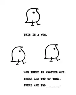 Die Produktivität und Kreativität von Kindern bestätigte Jean Berko 1958 gegen die dominante behavioristische Theorie mit ihrem Wug Test. Dabei brachte sie (englischsprachigen) Kindern Kunstwörter für erfundene Gegenstände und Tiere bei. Berko zeigte, wie Kinder Wörter behandeln, die sie noch nie gehört haben. Sie zeigte den Kindern z. B. ein Bild eines vogelähnlichen Fantasietiers. Dann benutzte sie das Kunstwort „Wug“ für dieses Tier und bat die Kinder, folgenden Satz zu vervollständigen: This is a wug. Now there is another one. There are two of them. There are two … Deutsch: „Das ist ein Wug. Hier ist noch einer. Also gibt es zwei davon. Es gibt also zwei…“ Meistens bildeten die Kinder die Mehrzahlform wugs. Daraus leitete Jean Berko ab, dass Kinder eigenständig und regelgeleitet neue Formen bilden können. Solche Experimente wurden mit ähnlichen Ergebnissen in vielen Sprachen wiederholt.[5]