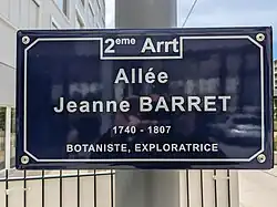 - Im Februar 2024 wurde an ihrem ehemaligen Wohnhaus Rue des Boulangers 13 im 5. Arrondissement von Paris eine Ehrenplakette mit der Beschriftung: „ICI VÉCUT JEANNE BARRET (1740–1807), EXPLORATRICE ET BOTANISTE, PREMIÈRE FEMME À ENTREPRENDRE UN TOUR DU MONDE DE 1767 À 1775, ELLE PRIT PART À L’EXPÉDITION DE BOUGAINVILLE“ (hier lebte die Forscherin und Botanikerin Jeanne Barret (1740–1807). Sie nahm als Teil der Bougainville-Expedition als erste Frau von 1767 bis 1775 an einer Weltreise teil). angebracht.[15]