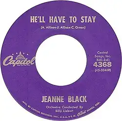 Knapp 19-jährig wurde Jeanne Black 1956 überregional bekannt durch einen Auftritt in der TV-Show Cliffie Stone’s Hometown Jamboree. Es folgten Engagements in Lake Tahoe und Las Vegas, und es begann eine Zusammenarbeit mit dem Gitarristen Billy Strange. 1960 erhielt Jeanne Black einen Plattenvertrag bei Capitol Records, wo im April 1960 die erste Single erschien. Die A-Seite mit Black als Solistin trug den Titel He’ll Have to Stay, auf der B-Seite sang sie im Duett mit einer gewissen Janie Black den Titel Under Your Spell Again. He’ll Have to Stay war ein so genannter Antwortsong auf den Jim-Reeves-Erfolg He’ll Have to Go. Während Reeves in seinem Song fordert, sein Nebenbuhler müsse gehen, antwortet Jeanne Black: „Er wird bleiben!“ Ebenso wie der Ursprungstitel gefiel dem Publikum der Antwortsong, er erreichte bei den Billboard Hot 100 Platz 4 und wurde insgesamt elf Wochen lang notiert. In den Country-Charts landete der Titel auf dem 6. und bei Rhythm & Blues auf dem 11. Rang. He’ll Have to Stay wurde ein Millionenerfolg und wurde mit der Goldenen Schallplatte ausgezeichnet.