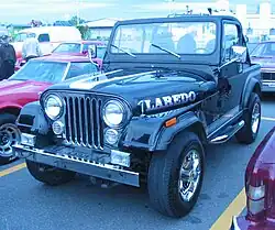 Ebenfalls als Sonderausstattung waren ein Hardtop und Stahltüren erhältlich. Neben dem einfachen Standardmodell gab es vom CJ-7 unter anderem die Ausführung Renegade sowie die Golden-Eagle-Edition und ab 1980 das besser ausgestattete Laredo-Modell. Letzteres ist an seinen unterschiedlichen Emblemen zu erkennen; es hat aufwendigere Sitze, bei denen die Rückenlehne verstellt werden kann, ein verstellbares Lenkrad, Drehzahlmesser, eine Uhr und ein Chromausstattungspaket, das Stoßfänger, Kühlergrill und Spiegel umfasst. 1980 wurde der Laredo erstmals mit einer AMC 20-Hinterachse ausgestattet, bis er Mitte 1986 mit einer Dana 44 ausgerüstet wurde. Für einen sehr kurzen Zeitraum wurde 1980 die Edition Golden Hawk angeboten. Sie unterschied sich von den anderen Modellen u. a. durch golden lackierte Räder und Nebellampen sowie, durch an der Motorhaube, angeschraubte Symbole.[1] Optional waren Scheibenbremsen vorn verfügbar, auch mit Bremskraftverstärker, eine 6-fach höhenverstellbare Lenksäule, Servolenkung und Klimaanlage. 1982 wurde die Jamboree-Edition u. a. mit speziellen Rädern und Leuchten am oberen Scheibenrahmen angeboten. Nur 630 Einheiten wurden produziert: 560 Topaz Gold Metallic und 70 Olympic White. Ebenfalls 1982 verbreitere Jeep die Spur des CJ-7 und des CJ-8 um 86 mm bzw. 117 mm.