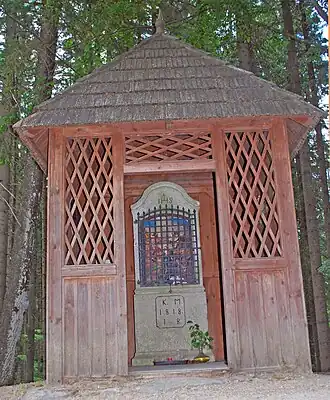 - Medvědí kámen (Bärenstein) nördlich von Jelení im Wald an der Hučina. Er erinnert an den angeblich letzten Böhmerwaldbären, der an der Stelle am 14. November 1856 während einer herrschaftlichen Treibjagd durch Johann Jungwirth aus Riedelhütte erlegt worden sein soll. Die alte Bärin, die ausgeweidet 230 Pfund wog, wurde präpariert und ist im Jagdschloss Ohrada ausgestellt. Nach dem Schattawaer Forstgedenkbuch wurde allerdings im Jahre 1864 von einem Wildschützen aus Wallern ein weiterer Bär geschossen, der Vorfall wurde durch die Fürsten Schwarzenberg jedoch nicht publik gemacht.[7]