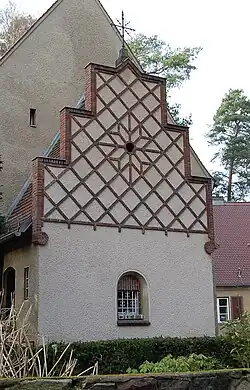 Das von einer Feldsteinmauer umgebene Kirchengebäude ist hell verputzt. An der nach Osten ausgerichteten Chorwand ist es mit einem gotisch anmutenden abgestuften Ziergiebel aus Backsteinen versehen. Der Kirchturm trägt eine zweistufige Holzspitze mit einer Turmuhr, deren Zifferblätter nach Osten und Norden weisen. Aufgrund der an eine Dorf- oder Waldkirche angelehnten Bauweise fügt sich die am Waldrand gelegene Kirche harmonisch in die Umgebung ein.