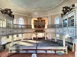 - Der ovale Raum wird durch vier rechteckige Kreuzarme erweitert. Diese sind im Kirchenraum durch Emporen und den Kanzelaltar abgetrennt. Über dem nördlichen Kreuzarm erhebt sich der Kirchturm mit Haube und hoher Doppellaterne. Der südliche Kreuzarm ist die Vorhalle mit Orgel und Altar.