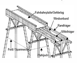 Die äußeren Pfähle sind bei Brücken, die in stark strömenden Gewässern liegen, meist schräg eingerammt, um den durch die Strömung verursachten Kräften besser standhalten zu können.[4] Manchmal sind zusätzliche Pfähle vor den Jochen eingerammt, welche Treibeis und anderes Treibgut von den Jochen fernhalten. Die Holzkonstruktion ist meist aus Eiche, da dieses Holz im Wasser am dauerhaftesten ist. Meist werden sie mit Teer behandelt, um zu verhindern, dass sie austrocknen und schwinden.[3] Bereits im Mittelalter wurden die Pfähle mit Pfahlschuhen versehen. Dieser Eisenbeschlag vereinfacht das Rammen der Pfähle.
