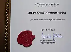 Der Künstler Johann Christian Reinhart wurde 1761 in Hof an der Saale geboren und starb 1847 in Rom. Ihm zu Ehren stiftete die Stadt Hof eine Plakette, die seit 1989 verliehen wird. Die Auszeichnung mit Überreichung einer Urkunde findet im Rahmen einer Feierstunde im Hofer Rathaus statt.