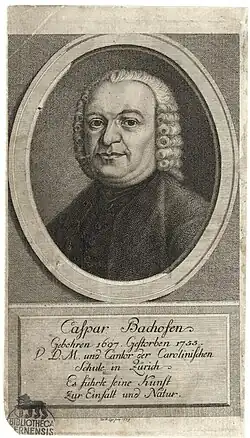 - ↑ Markus Jenny: Bachofen, Johann Caspar. In: Ludwig Finscher (Hrsg.): Die Musik in Geschichte und Gegenwart. Zweite Ausgabe, Personenteil, Band 1 (Aagard – Baez). Bärenreiter/Metzler, Kassel u. a. 1999, ISBN 3-7618-1111-X, Sp. 1567–1568 (Online-Ausgabe, für Vollzugriff Abonnement erforderlich)