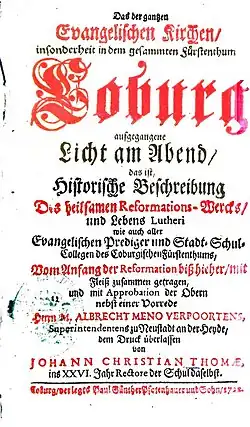 - Das der gantzen Evangelischen Kirchen, insonderheit in dem gesammten Fürstenthum Coburg aufgegangene Licht am Abend / das ist, Historische Beschreibung des heilsamen Reformations-Wercks und Lebens Lutheri, wie auch aller evangelischen Prediger und Stadt-Schul-Collegen des Coburgischen Fürstenthums, vom Anfang der Reformation biß hieher. Paul Günther Pfotenhauer und Sohn, Coburg 1722