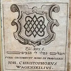 - [Hofnung der Erlösung Israelis, oder Klarer Beweiß der annoch bevorstehenden, und, wie es scheinet, allgemach-herannahenden grossen Jüden-Bekehrung] Joh. Christophori Wagenseilii, J.U.D. Juris Canonici & Publici, nec non LL. Oriental. Prof. Publici Altdorfini, Hofnung der Erlösung Israelis, oder Klarer Beweiß der annoch bevorstehenden, und, wie es scheinet, allgemach-herannahenden grossen Jüden-Bekehrung : sammt unvorgreifflichen Gedancken, wie solche nächst Verleihung Göttlicher Hülffe zu befördern / Johann Christoph Wagenseil, Editio altera, priore in 8. multò correctior, & octo aliis rarioribus Beati Autoris Opusculis, quorum conspectum sequens pagina exhibebit, adaucta, Nürnberg 1707