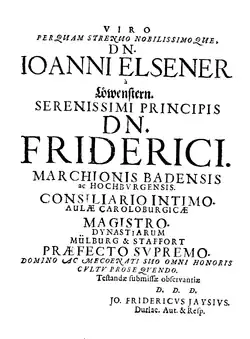 Der markgräflich baden-durlachische Kammersekretär Johann Elsener wurde am 11. Juni 1666 zum Geheimen Rat und Obervogt von Staffort und Mühlburg ernannt. Bald darauf markgräflicher Haushofmeister, galt er als Gönner von Mattäus Merian dem Jüngeren.[1]