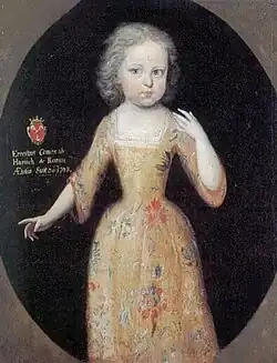 Johann Ernst ist auf diesem Bild, das 1708 gemalt wurde, wie alle anderen kleinen Knaben seiner Zeit, wie ein Mädchen gekleidet. Das geblümte goldfarbene Kleid ist mit einem tiefen Halsausschnitt versehen, und Johann Ernst trägt ein Fischbeinmieder. Nur die Inschrift und die Frisur verraten, dass es sich hier um einen Buben handelt.