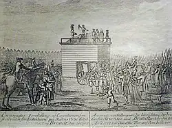 Am 28. April 1772 wurden Struensee und sein ebenfalls zum Tode verurteilter Vertrauter Enevold von Brandt vor den Toren Kopenhagens hingerichtet. Bei der Errichtung des Schafotts vor der Stadt gab es Verzögerungen, da zunächst kein Tischler zum Bau bereit gewesen war und kein Handwerker das Rad, auf das die Leichenteile geflochten werden sollten, hatte herstellen wollen. Die Handwerker machten sich erst unter Androhung von Folter und Kerker an die Arbeit. Die Räder wurden von einer alten Kutsche abmontiert, und ungefähr 30.000 Leute strömten herbei, um der Hinrichtung beizuwohnen.[45] Struensee musste mit Münter in der Kutsche warten, bis Brandt hingerichtet war. Dann wurde auch er geköpft. Beiden wurde erst die rechte Hand und dann der Kopf abgeschlagen. Ihre Leichen wurden gevierteilt und auf ein Rad geflochten. Zwar jubelte die aufgehetzte Menge auf den Straßen und zerstörte Bordelle, die man durch Struensees Reformen gefördert glaubte, und Häuser seiner Anhänger oder derjenigen, die man dafür hielt, doch war auch die Ansicht weit verbreitet, dass die Todesstrafe insbesondere für Brandt übermäßig hart gewesen sei.[46] Da vom Prozess selbst wenig an die Öffentlichkeit gedrungen war, hatten viele, wie etwa Lessing, nicht mit einer Hinrichtung gerechnet.[44]