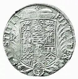 | Rs.: Unter dem Herzogshut, zwischen zwei Palmwedeln mit aufgeprägter getrennter Jahreszahl Wappenschild mit 20 Feldern und Herzschild mit sächsischem Wappen; unterhalb in ovalem Kranz Wertbezeichnung 2/3; Umschrift oben rechts beginnend PIETATE & IVSTITIA◦ (Frömmigkeit und Gerechtigkeit) 1. Reihe: Landgrafschaft Thüringen, Herzogtum Kleve und Markgrafschaft Meißen 2. Reihe: Herzogtum Jülich, Grafschaft Orlamünde, Herzogtum Bergen 3. Reihe: Pfalzgrafschaften Sachsen und Thüringen 4. Reihe: Markgrafschaften Landsberg und Burggrafschaft Altenburg 5. Reihe: Herrschaft Pleissen und Herrschaft Eisenberg 6. Reihe: Grafschaft Brehna, Grafschaft Sayn und Grafschaft Wittgenstein 7. Reihe: Grafschaften Mark, Henneberg und Ravensberg 8. Reihe: Herrschaft Homburg, Regalienfeld und Herrschaft Freusburg[2] | ||