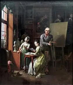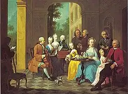 - Familie Timmermann, Leinwand, 91,5 × 118 cm (Bildmaß), Signatur: bez. Mitte r.: J H Tischbein Pinx 1758, (online, Gemäldegalerie Alte Meister, Museumslandschaft Hessen Kassel)