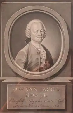 Johann Jacob Moser (* 18. Januar 1701 in Stuttgart; † 30. September 1785 ebenda) war ein bedeutender württembergischer Staatsrechtslehrer und mit dem Titel Landschaftskonsulent juristischer Berater der württembergischen Landstände.