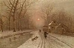 - Winterabend (Bauersleute auf einer Dorfstraße im Abendrot)