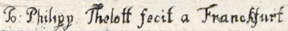 Johann Philipp Thelott war sehr produktiv. Allein 120 Einzelblätter sind von ihm bekannt. Hinzu kommen zahlreiche Arbeiten für Verlage, so etwa auch für die Topographia Germaniae und das Theatrum Europaeum des Frankfurter Verlags Thomas Matthias Götze[10], damals der bedeutendste deutsche Buchhändler und Verleger.[11] 1664 erschienen dort die frühesten, heute bekannten, von Johann Philipp Thelott gefertigten Kupferstiche. Vorlagen für seine Stiche stammen unter anderem von: