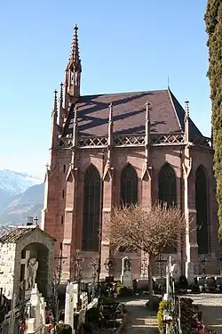 Erzherzog Johann starb im 78. Lebensjahr am 11. Mai 1859 um 9 Uhr an einer Lungenentzündung. Er wurde am 14. Mai 1859 in Graz bestattet und erst am 21. Juni 1869 in das inzwischen fertiggestellte Mausoleum bei Schloss Schenna überführt, einem Ansitz der Grafen von Meran in Schenna bei Meran (Südtirol).[11] Das Schloss hatte er 1844 gekauft und sein Sohn, Franz Graf von Meran, ließ das Mausoleum als letzte Ruhestätte erbauen.[12]