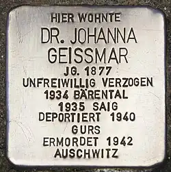 - ↑ Familie Geissmar auf der Website der Initiative Stolpersteine für Heidelberg, abgerufen am 5. September 2017.