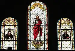 Im Vorraum der Kirche befinden sich eine bronzene Gedenktafel und die Urne von Otto Hoffmann, Direktor der Steinzeugfabrik, die 6.000 Goldmark für den Bau der Kirche gespendet hatte. 1956 wurden dort zwei Sandsteintafeln mit den in den beiden Weltkriegen getöteten und vermissten Gemeindemitgliedern aufgestellt, die der Bildhauer Robert Stieler schuf. Der Taufstein, ebenfalls aus rotem Sandstein, stammt aus dem Jahr 1959.