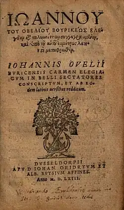 - Carmen elegiacum : in belli sectatores conscriptum et ab eodem Latinis versibus redditum. Oridryrus & Buys, Dusseldorpii 1563.