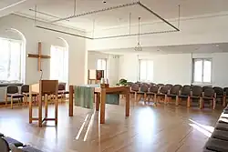 Im Erdgeschoss befinden sich verschiedene Räumlichkeiten, die für pfarreiliche Anlässe Verwendung finden. Über eine Treppe gelangt man ins Obergeschoss, wo sich die Kirche Johannes XXIII befindet. Es handelt sich um einen rechteckigen Raum mit grossen Fenstern, die das Tageslicht ins Innere der Kirche einlassen. Der mittlere Bereich des Raumes weist eine etwas höhere Decke auf. Säulen tragen die Last des Turmes. Im Zentrum des Raumes befindet sich der Altarbereich, der jedoch durch keine Erhöhung vom Kirchenboden abgehoben ist. Auf diese Weise wird die Gleichrangigkeit von Priester und Gemeinde ausgedrückt. Als Zeichen dafür, dass die Eucharistie die Mitte der Gemeinde ist, sind die Stühle für die Gottesdienstbesucher im Halbkreis um den Altar aufgestellt. Der Boden, der Altar und der Ambo bestehen aus unterschiedlichen Holzarten. Dies drückt die Verbundenheit der Gemeinde mit der Schöpfung aus. Dadurch, dass die Fenster nicht mit Buntglas bestückt wurden, entsteht eine direkte Sicht vom Kircheninnern nach draussen. Die unmittelbare Nähe der katholischen Kirche zur reformierten Kirche und zum Schloss Greifensee unterstreicht den Wunsch der Gemeinde nach Verbundenheit mit den anderen christlichen Gemeinschaften und der Bereitschaft, sich als katholische Kirche in der Gesellschaft zu engagieren.[8]
