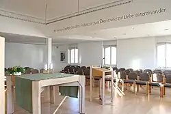 Der Kunstschreiner Primo Lorenzetti schuf mit der Kirche Johannes XXIII. ein Gesamtkunstwerk, dessen einzelne Elemente sich miteinander durch ihre Symbolik verbinden. Vor der Eingangstür zur Kirche im ersten Stock befindet sich das Weihwasserbecken. Eine metallene Halbkugel birgt eine Glasschale, in der sich das Weihwasser befindet. Wie alle anderen auf dem Boden stehenden Elemente der Innenausstattung besteht auch dieses Objekt aus zwei Holzarten: Die senkrechten Teile sind aus Ulmenholz, die waagerechten Teile aus Esche gefertigt. In der Mitte der Frontwand hängt ein gleichschenkliges Kreuz, das seine Entsprechung im Fassadenkreuz an der Aussenwand der Kirche findet. Auf der Seite des Altarbezirks steht an der Wand ein Zitat aus dem Galaterbrief (Gal 5, 13): „Ihr seid zur Freiheit berufen – nutzt sie zum Dienste und zur Liebe untereinander.“ Der Altar ist ein einfacher Holztisch, der den Abendmahlscharakter der Eucharistiefeier unterstreicht. Die Konstruktion des Tisches und aller liturgischen Möbel beruhen auf dem Quadrat, dem Kreis und der unendlichen Zahlenreihe Pi. Das Quadrat „ist das Symbol des Festen, Unveränderlichen und der Ewigkeit. Der Kreis hingegen ist die einfachste Form der Darstellung des Unendlichen, des Ewigen.“[9]