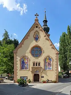 An der 1879/1883 historisierend veränderten Fassade befindet sich ein Kreisfenster mit Vierpassmaßwerk, darunter das Portal mit Steinpfeilern. Das Mosaik im Tympanon stellt Gottvater mit den Gesetzestafeln dar und wurde 1976 von Andreas Weißenbach geschaffen. Die in die Fassade eingetieften Zierflächen wurden 1976/1978 von Elmar Kopp ausgemalt. Sie zeigen links den Evangelisten Johannes mit dem Lamm aus der Apokalypse, rechts die Taufe Christi im Jordan durch Johannes den Täufer und im Giebel Maria mit Kind.
