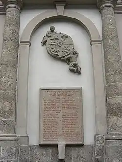 In der Blendnische an der Südseite der Kirche ist eine Gedenktafel für die in den beiden Weltkriegen gefallenen Mitglieder der K.Ö.H.V. Leopoldina Innsbruck. Es wurde in seiner ursprünglichen Form im Frühjahr 1926 für die Gefallenen des Ersten Weltkriegs errichtet und von dem Architekten Fritz Michael Müller gestaltet. Über der Gedenktafel befindet sich das Wappen der Leopoldina, getragen von zwei Putti. Nach dem Zweiten Weltkrieg wurde die Gedenktafel erweitert. Tafel und Wappen sind aus Breccienbeton.[2]