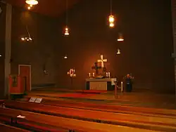 Hinter dem Eingangsbereich befindet sich eine nur mit Glaswänden abgetrennte Taufkapelle. Über Eingangsbereich und Taufkapelle liegt eine Empore mit der Orgel und Nebenräumen. Die Sakristei schließt seitlich an das Kirchenschiff an. Die Kirche war zunächst auf 460 bis 520 Sitzplätze ausgelegt. Das Kirchenschiff erhält durch die farbigen Bienenwabenfenster in den Seitenwänden direkten Lichteinfall.