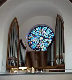 Der Chorraum wird durch eine Halbrundapsis in Kirchenschiffbreite gegliedert. Vom Triumphbogen bis zur südlichen Giebelwand erstreckt sich eine u-förmige Empore, die an den Längsseiten auf je sechs Pfeilern ruht. Auf der mittleren schmalen Empore befindet sich die Orgel. Dahinter ist die bunte Fensterrose zui sehen. Der Gottesdienstsaal wird durch Gurtbögen gegen eine pultförmige kassettierte Decke abgestützt.