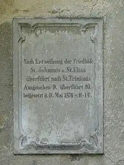 Das Gelände war mit Friedhofsmauern umschlossen. Der Kirchhof hatte zwei Portale in Richtung Stadt Dresden, die mit Figuren und Sprüchen aus der Bibel geschmückt waren. Vom Tor des Kirchhofs hatte sich um 1900 ein Relief mit der Darstellung des Jüngsten Gerichts erhalten.[27] Der Friedhof wurde 1633 erweitert, indem anschließende Gärten aufgekauft wurden. Ein Teil des Geldes zum Ankauf des Geländes wurde dabei von der Frauenkirchgemeinde geliehen.[10] Aufgrund der Pest erfolgte 1680 eine weitere Erweiterung des Friedhofs. Zuletzt wurde der Friedhof im Jahr 1721 vergrößert, indem der Stadtrat das Rechenberg’sche Grundstück zur Borngasse hin ankaufte.[28] Die Erweiterung war unter anderem notwendig geworden, weil Bestattungen auf dem Frauenkirchhof der Stadt seit 1715 untersagt waren. Im Zuge der Säkularisation des Frauenkirchhofs von 1714 bis 1724 wurden zahlreiche Särge und Grabsteine auf den Johanniskirchhof überführt.