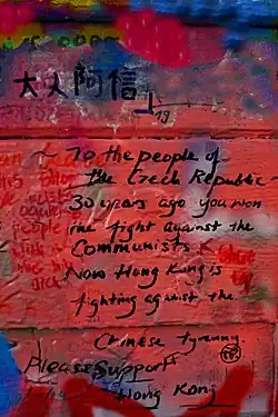 - ↑ Phoenix Un: Imagine that – 'support HK' messages on Prague wall. In: The Standard. 18. Juli 2019, abgerufen am 18. Juli 2019 (englisch).