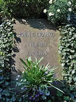 1973 erstickte Cranko nach einer allergischen Reaktion auf eine Schlaftablette, die er während eines Transatlantikfluges von Philadelphia nach Stuttgart eingenommen hatte, zwei Tage nach dem Ende einer erfolgreichen Tournee durch die Vereinigten Staaten.[5] Das Flugzeug musste in Dublin notlanden, wo Cranko in einem Krankenhaus für tot erklärt wurde.[3] Sein Grab befindet sich auf dem Stuttgarter Solitude-Friedhof neben dem gleichnamigen Schloss.