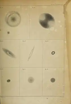Illustrationen zum Hantelnebel aus „Observations of Nebulae and Clusters of Stars, Made at Slough, with a Twenty-Feet Reflector, between the Years 1825 and 1833“ in Philosophical Transactions of the Royal Society, London, 1833