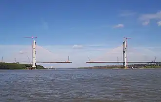 Zentrales Element der 3.661 m langen Brücke ist die zweihüftige Schrägseilbrücke (971 m) mit einer Spannweite von 482 m zwischen den zwei H-Pylonen aus Stahlbeton. Diese besitzen eine Höhe von 158,5 m von der Fundamentunterkante und sind über 50 m tief im Flussbett mittels Pfahlgründung verankert. Dazu wurden je 21 Stahlrohre mit 2,4 m Durchmesser in den Boden gebohrt, mit Beton verfüllt und in die jeweiligen Fundamente integriert. Der 22 m breite Fahrbahnträger ist als Stahlvollwandträger mit einer 24 cm dicken Fahrbahn aus Stahlbeton ausgeführt und wird von 136 Kabeln getragen, die an den Pylonen im Fächersystem angeordnet sind.[6]