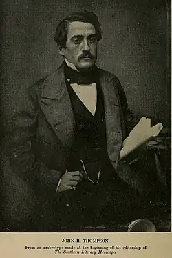 John Thompson, Sohn des Ladenbesitzers John Thompson und dessen Ehefrau Sarah Dyckman, absolvierte 1842 die University of Virginia als Chemiker und 1845 als Jurist. Obwohl durch die Schule von William Barton Rogers und James Joseph Sylvester gegangen, war er danach nicht als Naturwissenschaftler tätig. Auch die juristische Laufbahn ließ er links liegen und gab 1847 bis 1859 den Southern Literary Messenger heraus. Sein Vater hatte ihm diese Zeitung gekauft, die zuvor von Edgar Allan Poe herausgegeben worden war. 1859 wechselte John Thompson von Richmond nach Augusta (Georgia) in die Redaktion der Southern Field and Fireside, einer Zeitung für Landwirtschaft und Literatur.[1] Der Literat John Thompson arbeitete eng mit Edgar Allan Poe, William Gilmore Simms (1806–1870), Henry Timrod, Paul Hamilton Hayne, John P. Kennedy, John Esten Cooke (1830–1886) und Philip Pendleton Cooke (1816–1850) zusammen.