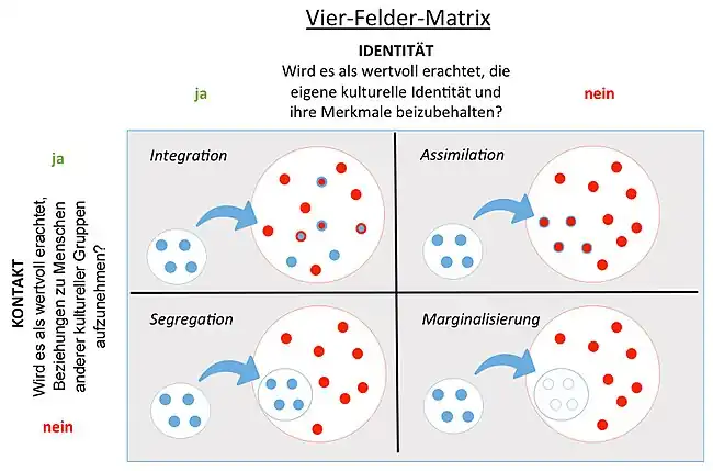 - Integration: Es wird sowohl die Ursprungskultur beibehalten als auch ein reger Kontakt zur dominierenden Kultur gepflegt.